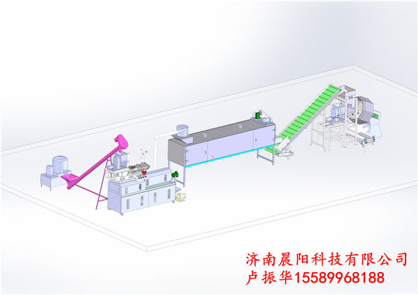 濕法生產(chǎn)線:拌粉機(jī)-螺旋輸送機(jī)-調(diào)制器-膨化機(jī)-烘干機(jī)-批次稱重式調(diào)味混合機(jī)