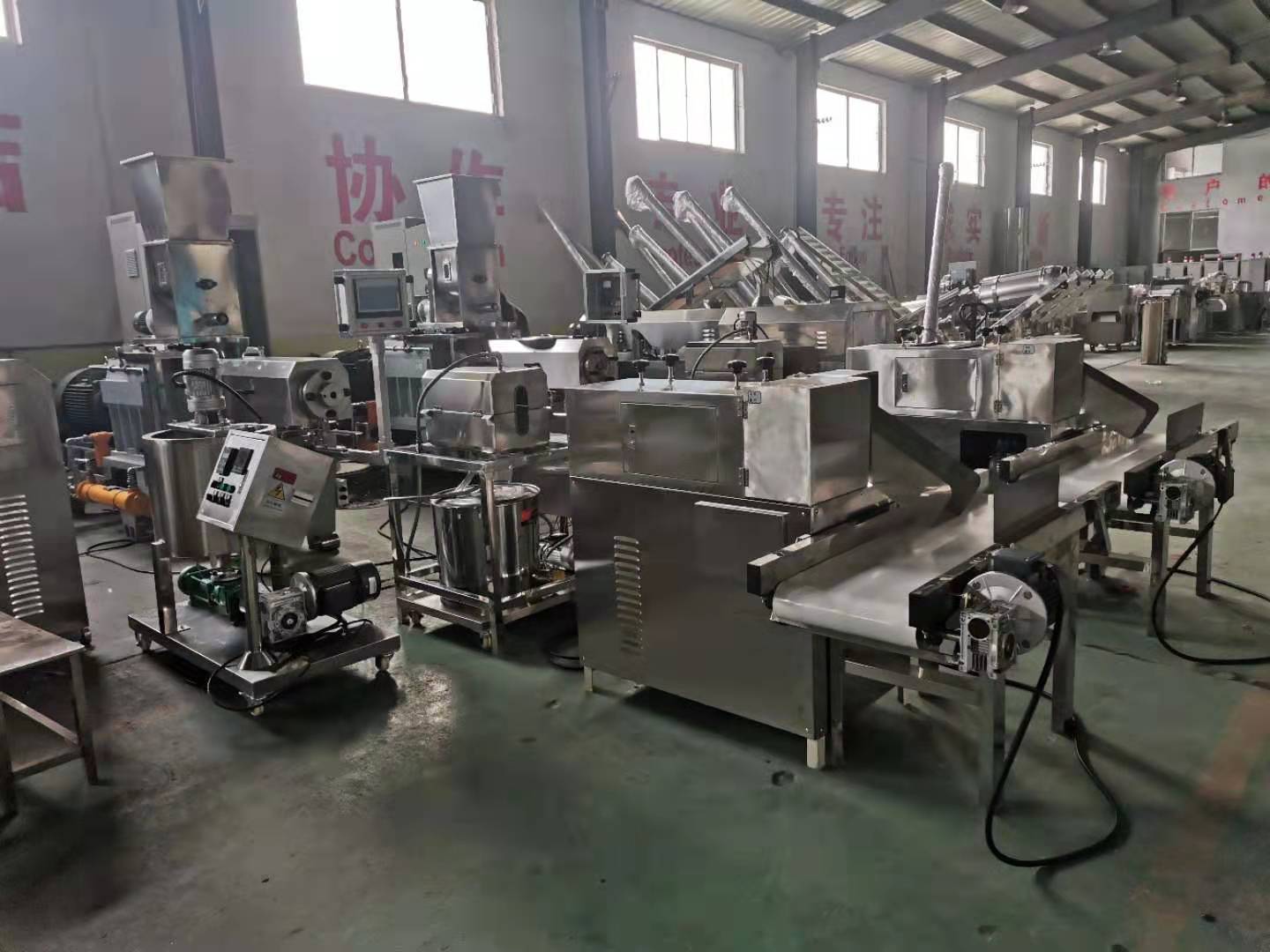 一、工藝流程: 原料配制→拌粉→輸送→擠壓膨化→注芯→整形切斷→輸送→干燥→噴油→調(diào)味→(包裝)