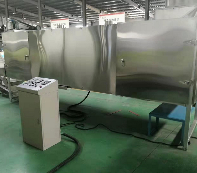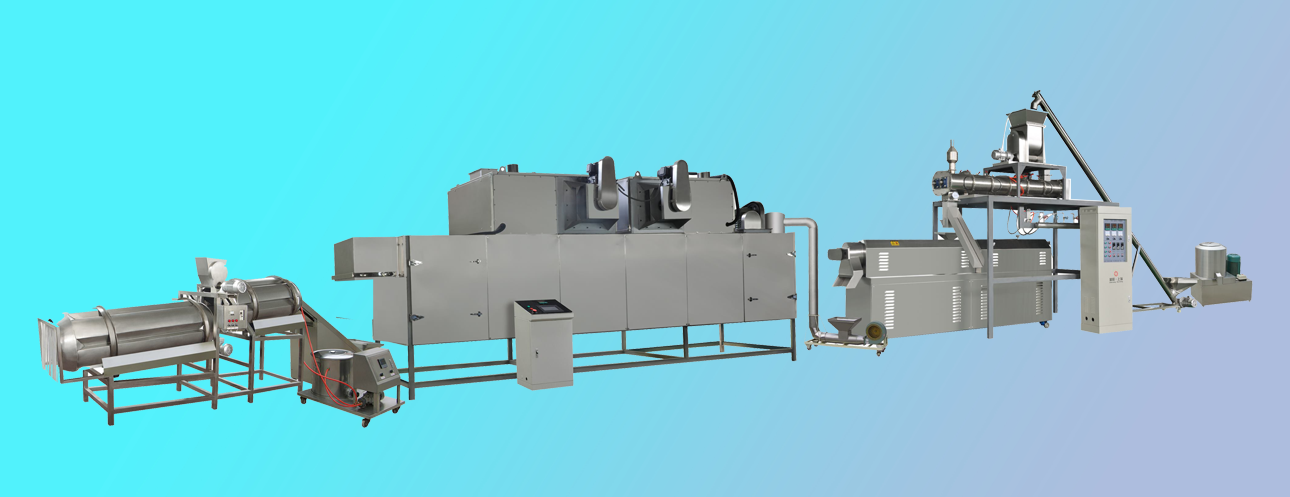拌粉機→螺旋上料機→(調(diào)制)雙螺桿膨化機→風送機→多層烘干機-滾筒噴油機