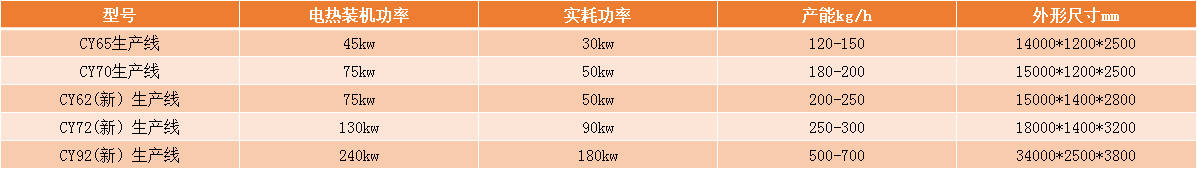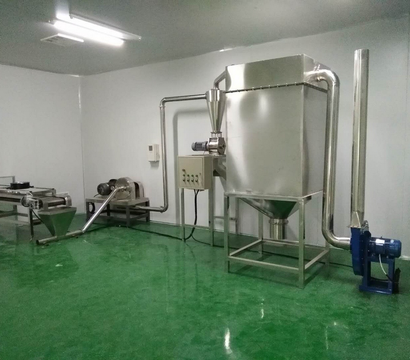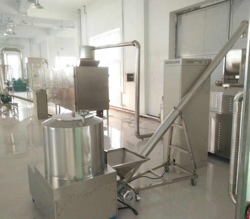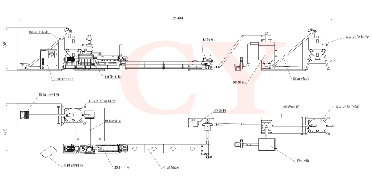 生產(chǎn)線構(gòu)成:拌粉機(jī)→螺旋提料機(jī)→膨化主機(jī)→冷卻輸送機(jī)→除塵粉碎機(jī)