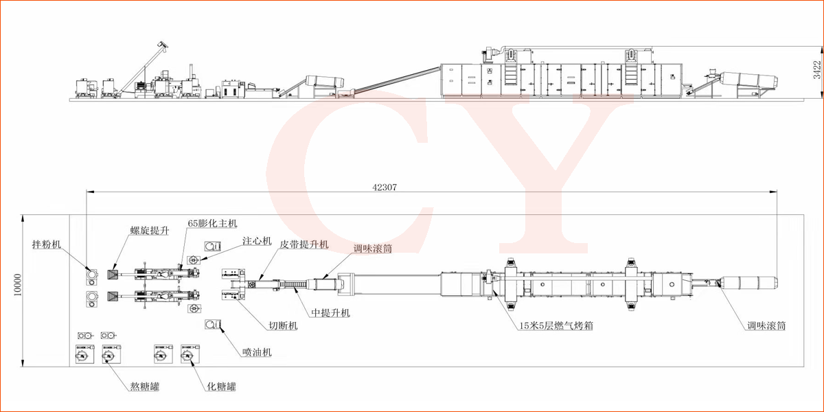 原料混合-膨化-夾心-整形切斷-烘干-噴油調(diào)味-冷卻-包裝