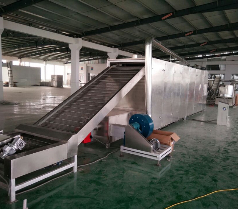 拌粉機→螺旋上料機→雙螺桿膨化機→夾心機-整形切斷機→提升機→六米五層烘干機-雙筒調(diào)味機