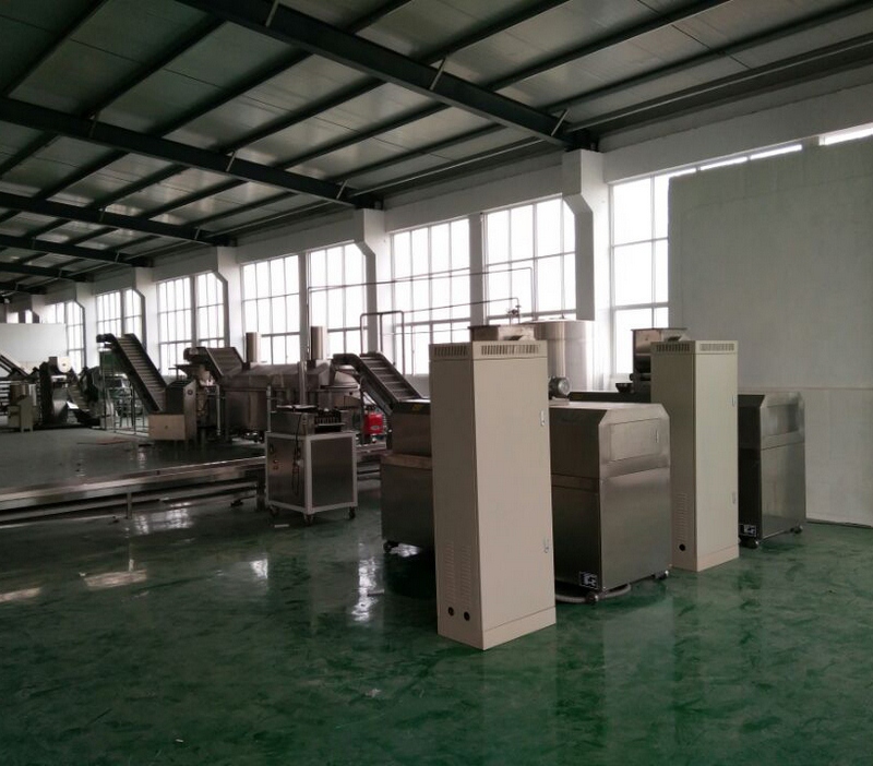 拌粉機(jī)→螺旋上料機(jī)→雙螺桿膨化機(jī)→整形切斷機(jī)→輸送機(jī)→提升機(jī)-稱斗-