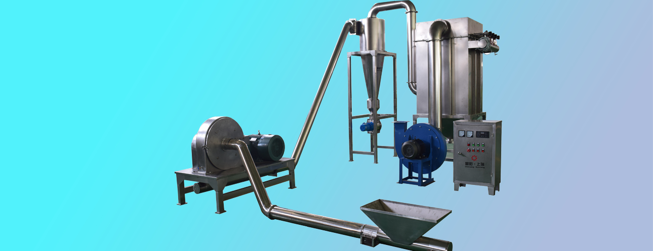 自吸進料管道及料斗、粉碎機主機、薩克龍關(guān)風機卸料器、箱式除塵器、脈沖器、引風機、排風管道、控制電柜