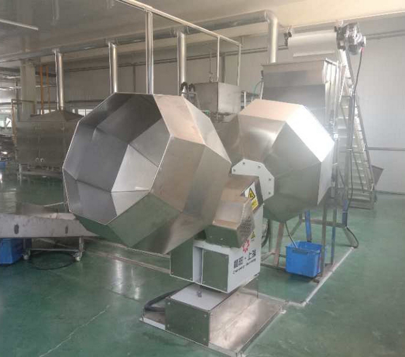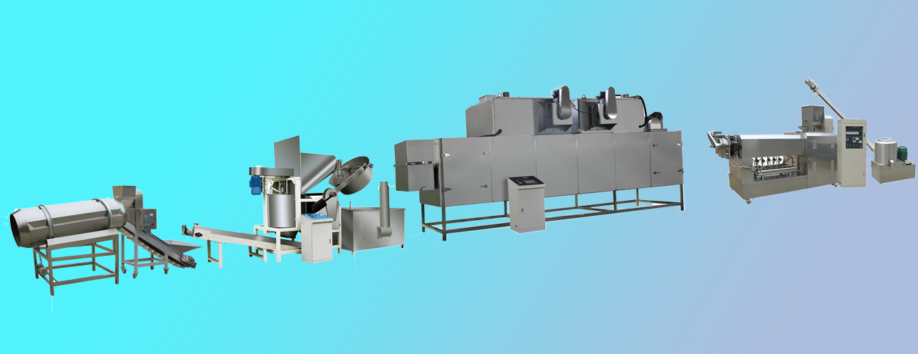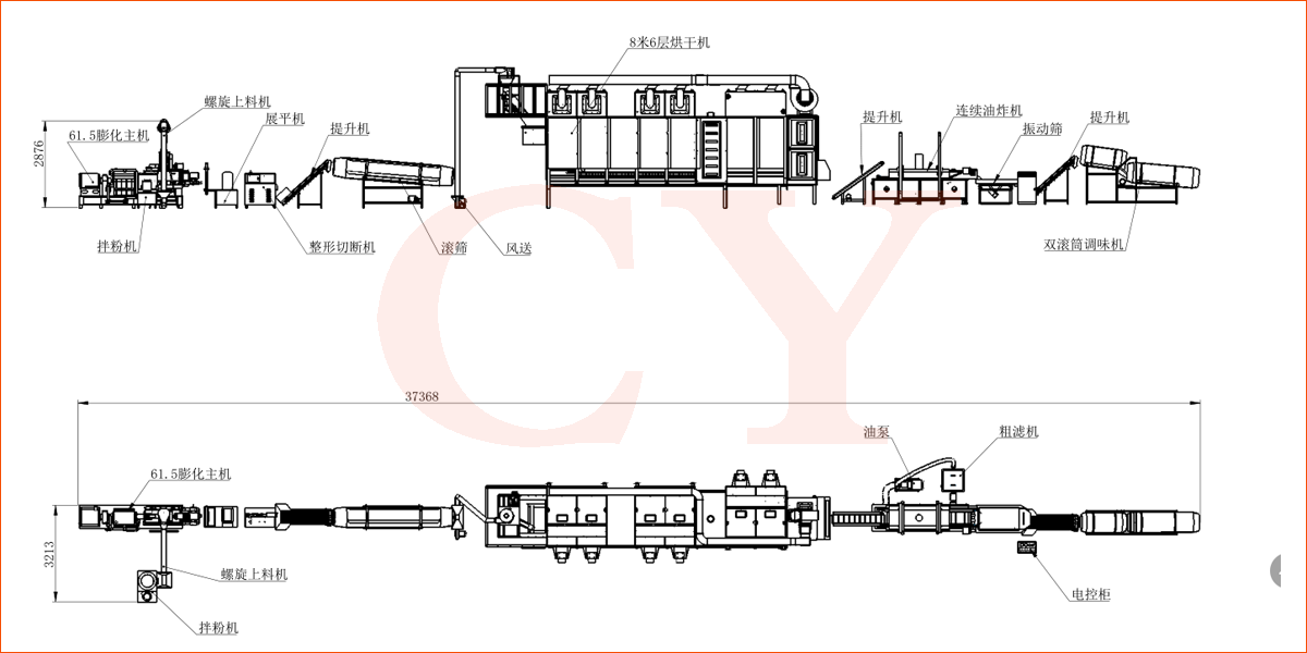 拌粉機(jī)→皮帶上料機(jī)→單螺桿擠出機(jī)→-提升機(jī)-八米五層干燥機(jī)-油炸機(jī)-震動(dòng)脫油機(jī)-單滾筒調(diào)味機(jī)